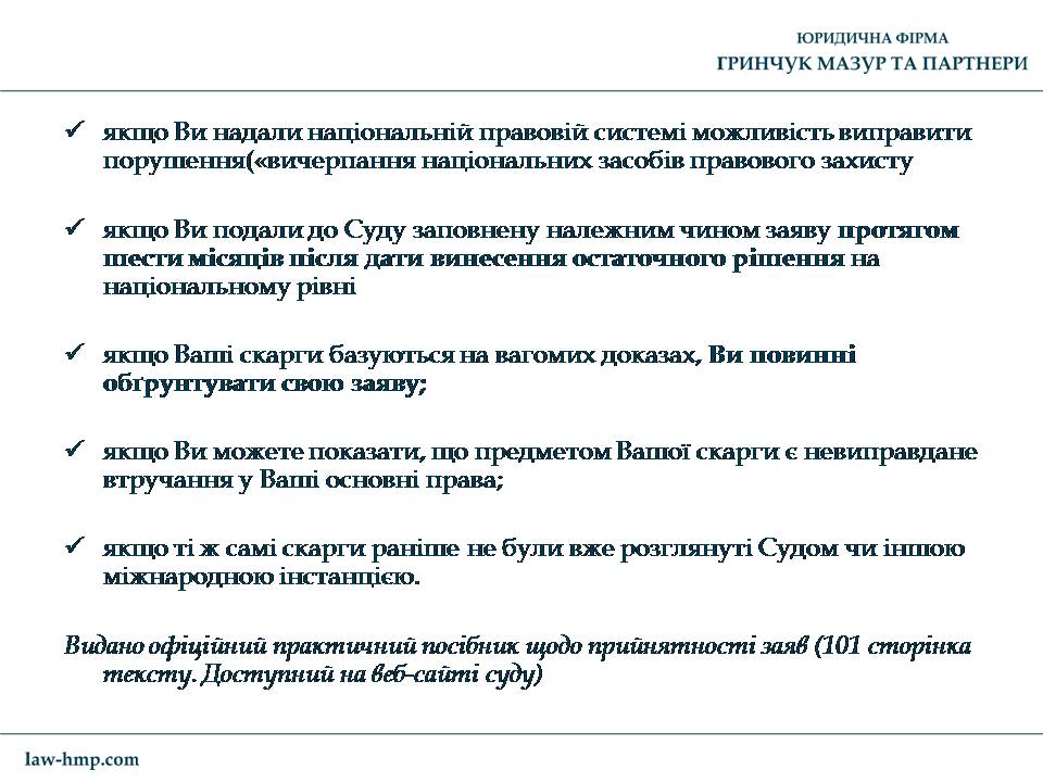Презентация с выступления на конференции во Львове управляющего партнера ЮФ «Гринчук Мазур и партнеры» Андрея Гринчука на тему «Что нужно знать для защиты своих прав в Европейском суде по правам человека».