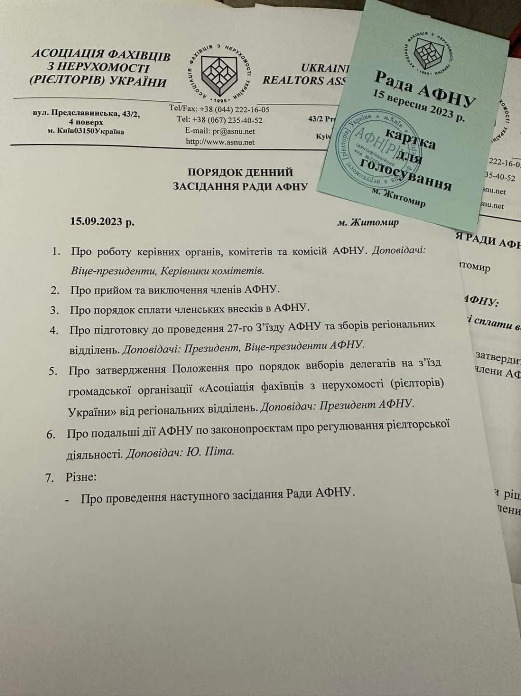 Надалі виступив Віце-президент Володимир Яцуба, який прозвітував про роботу комітету з навчання та підвищення кваліфікації і нагадав головам відділень про завчасне повідомлення комітету про заплановані сертифікаційні курси. Віце-президент Ігор Балака повідомив присутніх про проведені зустрічі з керівництвом НАЗК та Мінекономіки та доведення інформації про недопустимість прийняття законопроєкту 3618. Також Ігор Миколайович нагадав про заплановану участь делегації АФНУ в Конгресі НАР, який пройде в листопаді цього року в м. Анахайм. Більш детальна інформація міститься на сайті АФНУ за посиланням  https://www.asnu.net/news/3837/. Голова Комітету по міжнародним відносинам АФНУ Ольга Архіпова розповіла учасникам про навчальні курси, які проводяться спільно з НАР та які заплановані на майбутнє. Асоціація ще раз висловлює свою подяку спікеру Фурхаду Вакваду за надані знання та нашій колезі, члену НАР Олесі Дроздовій за переклад матеріалу. Також пані Ольга повідомила про збільшення членів НАР від Асоціації за останній період на 86 рієлторів, загальна кількість вже добігає цифри 600 членів. Член Комітету з рієлторських технологій Костянтин Мішустін доповів присутнім про роботу комітету на засіданнях якого розглядають питання застосування різних  способів роботи на ринку нерухомості, а також питання організації роботи агенцій нерухомості, набору персоналу та вивчення міжнародної практики.  Голова Благодійного фонду «Рієлтори України» Андрій Правдін повідомив інформацію про пошук додатковий джерел фінансування, направлення листів в європейські профільні асоціації та продовження роботи з Національною асоціацією рієлторів США. Вже після закінчення Ради Ігор Балака розмістив новину, що НАР зареєстрував Фонд допомоги міжнародним рієлторам американської Асоціації, що прискорить можливість отримання допомоги від наших заокеанських партнерів.