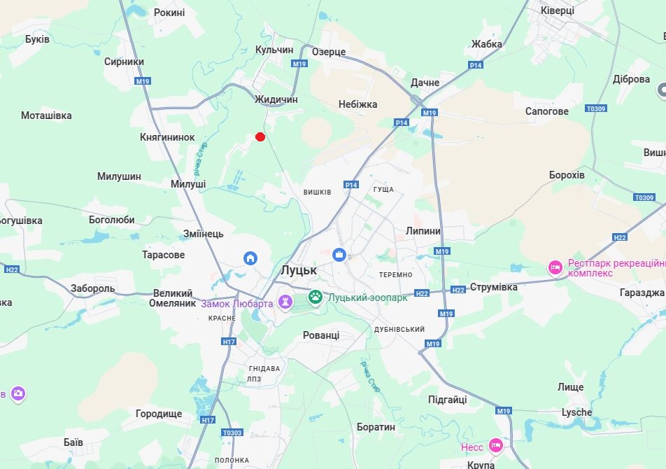 с. Жидичин (кінець луцької вул. Героїв УПА). Фасад - 102 м., перед в'їздом с. Липляни, 4 км. до перехрестя вул. Ківерцівська-Набережна, 1 км до об'їзної м.Луцька