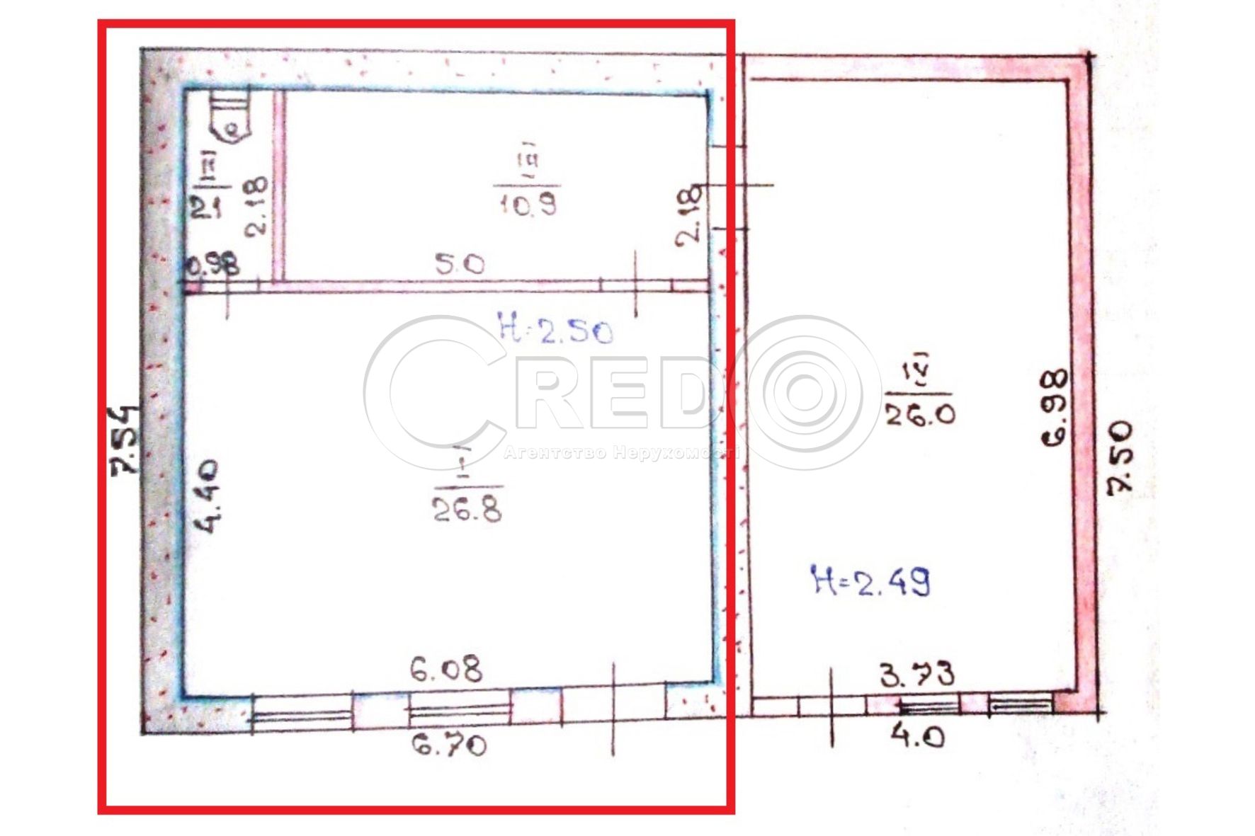 - Висота стелі 2.50м