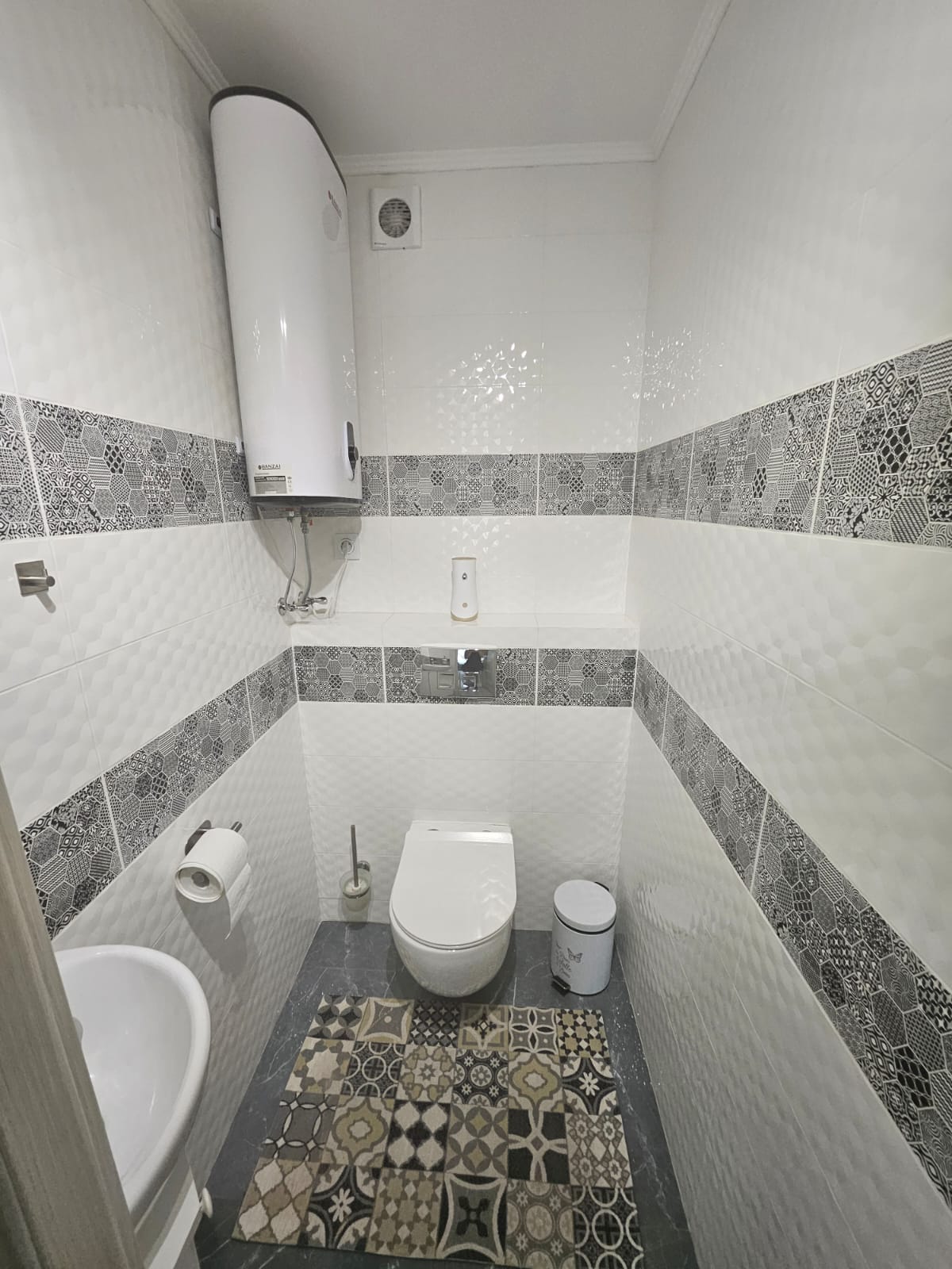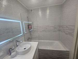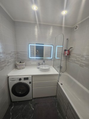 Ванна кімната 4,1 м² оснащена вбудованою тумбою, стільницею з раковиною Rawak і теплою підлогою — це комфорт, який відчуваєш щодня. Окремий сучасний туалет 1,9 м² з інсталяцією та маленькою раковиною — зручне рішення для щоденного використання.
