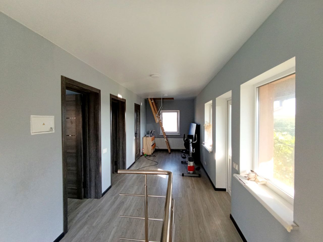 2-й поверх: дві спальні 16.1 і 10.3 м2 в одній спальні гардеробна, 3 м2 – санвузол з душовою кабіною, 15 м2 – коридор (зона відпочинку, спорт куток), і вихід на горище (складна дробина)