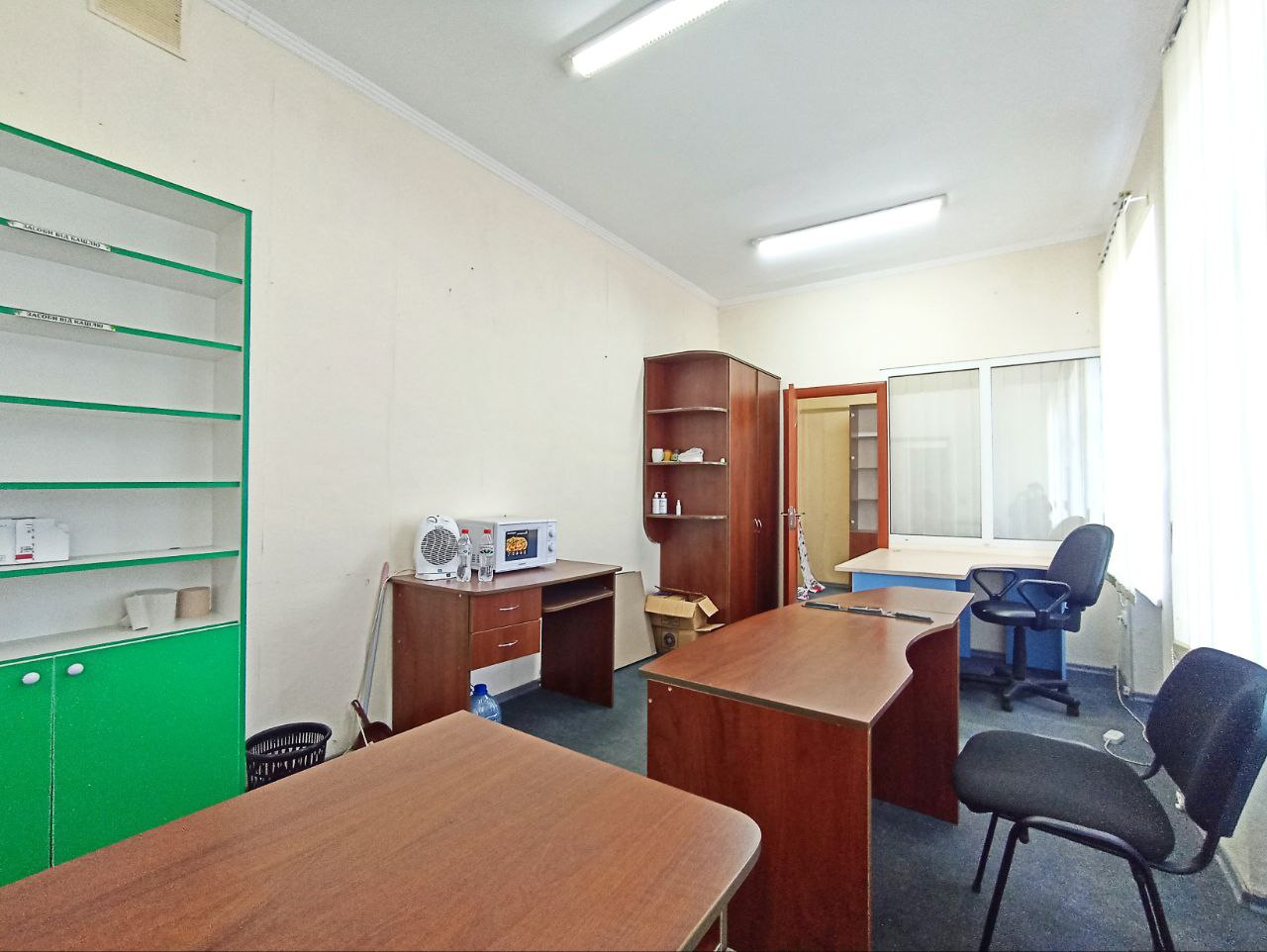 Приміщення Площею 30.1 м.кв., правильної прямокутної форми 2 кабінети (один з них прохідний), три вікна в більшому і одне вікно в меньшому. Цілодобовий доступ. Санвузол на поверсі. Без опалення. Меблі як на фото.