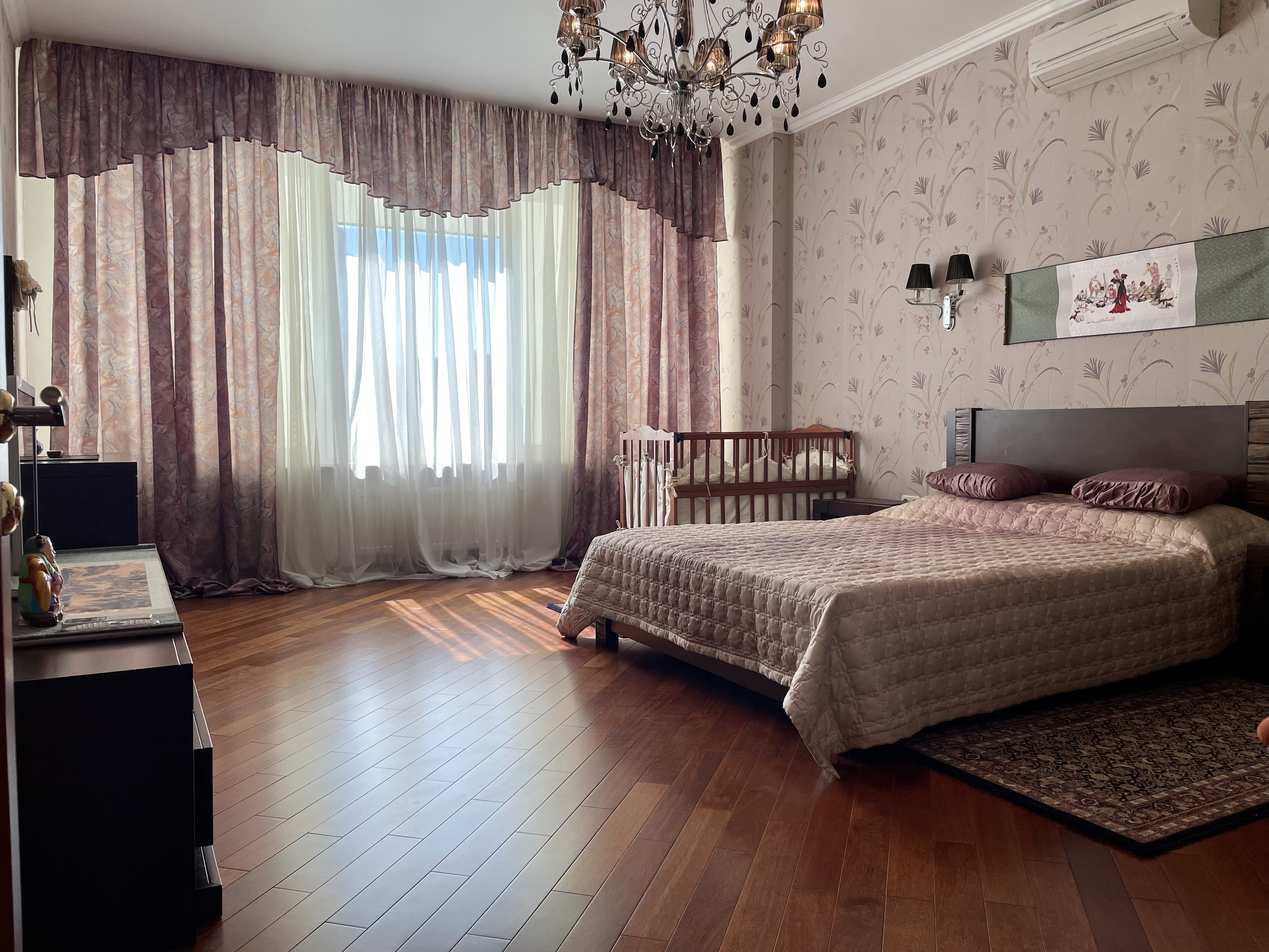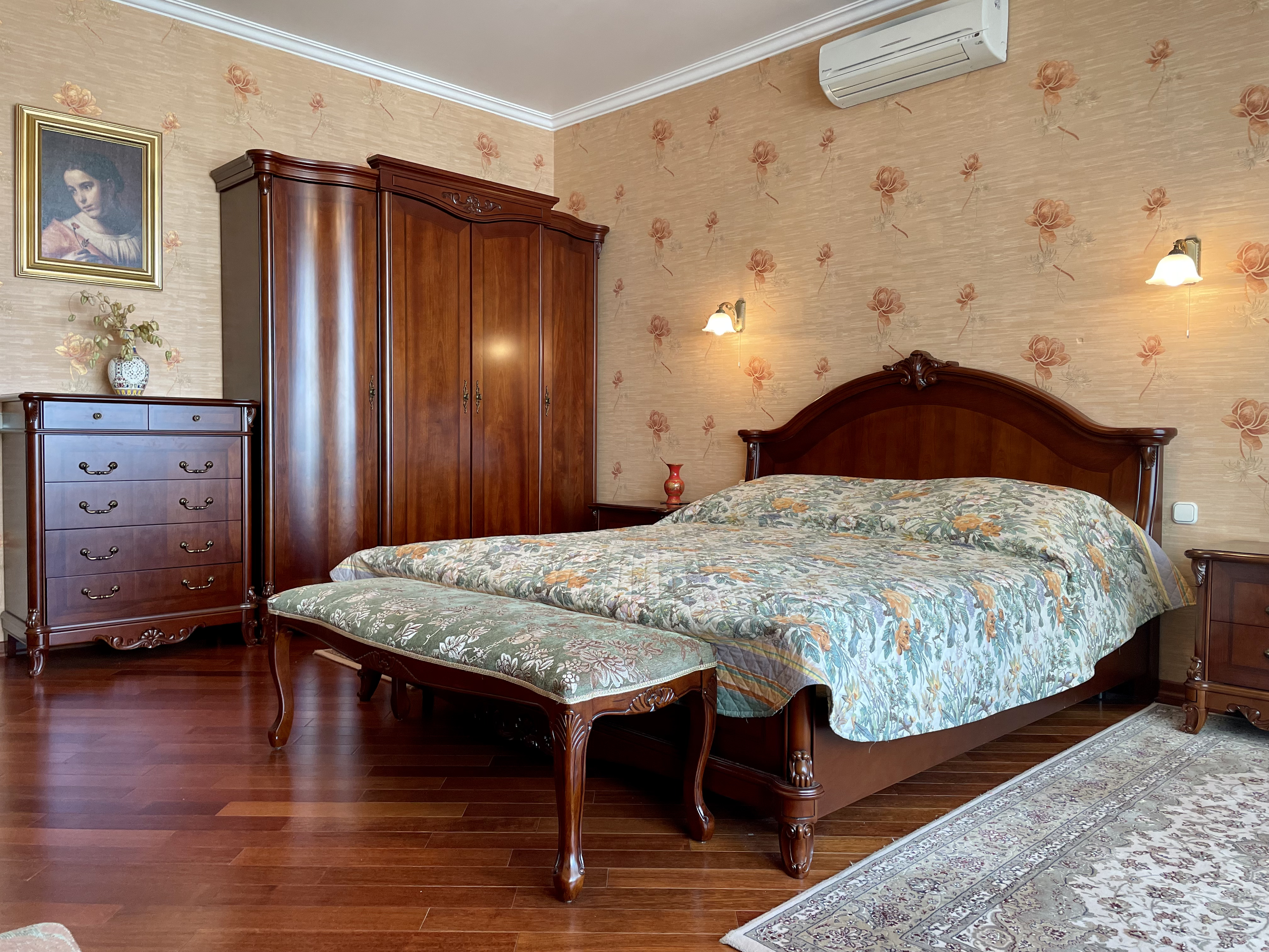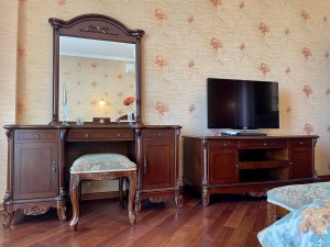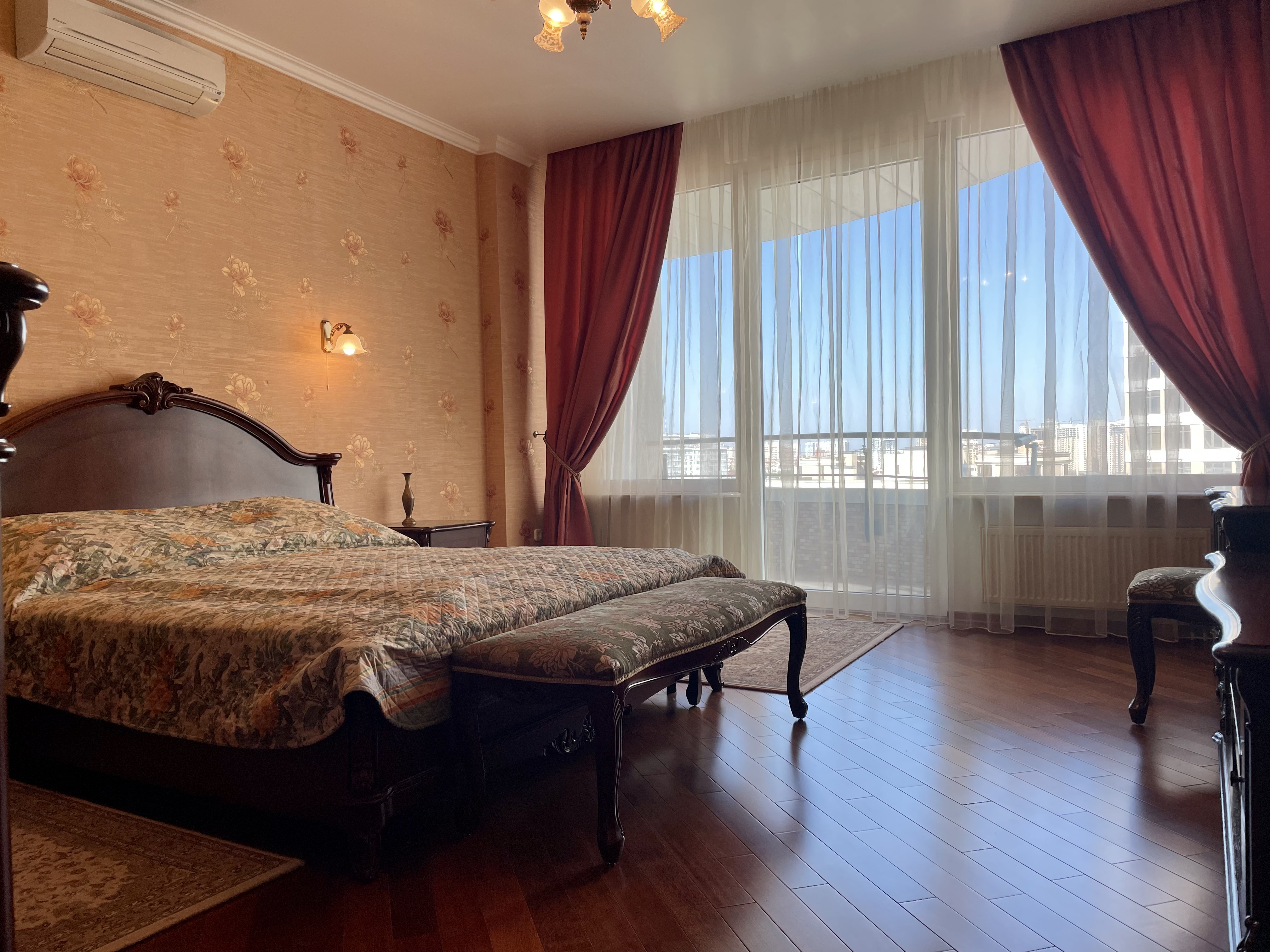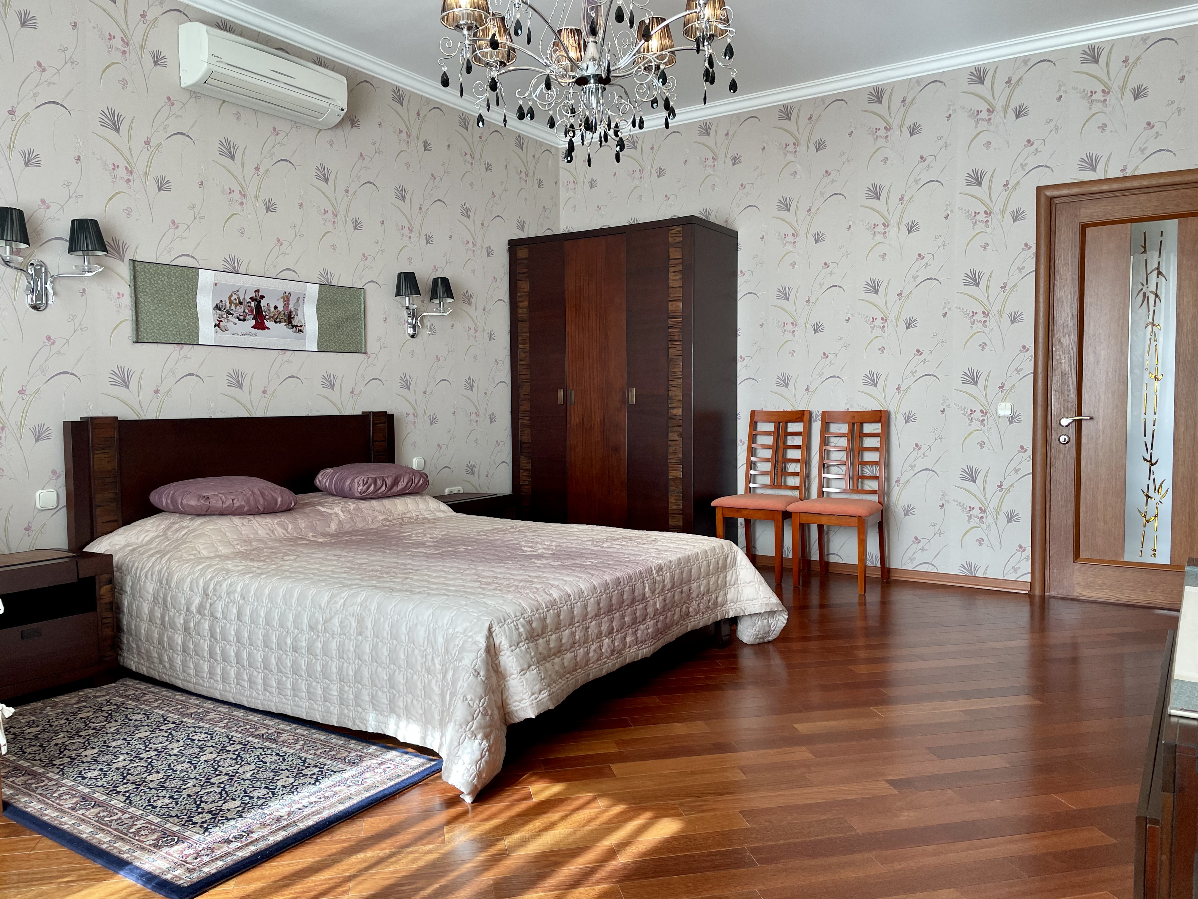 Планування: кухня, простора вітальня та дві окремі спальні. Виконаний ремонт у класичному стилі. Квартира повністю укомплектована меблями та побутовою технікою. У кімнатах — два двоспальні ліжка та диван.