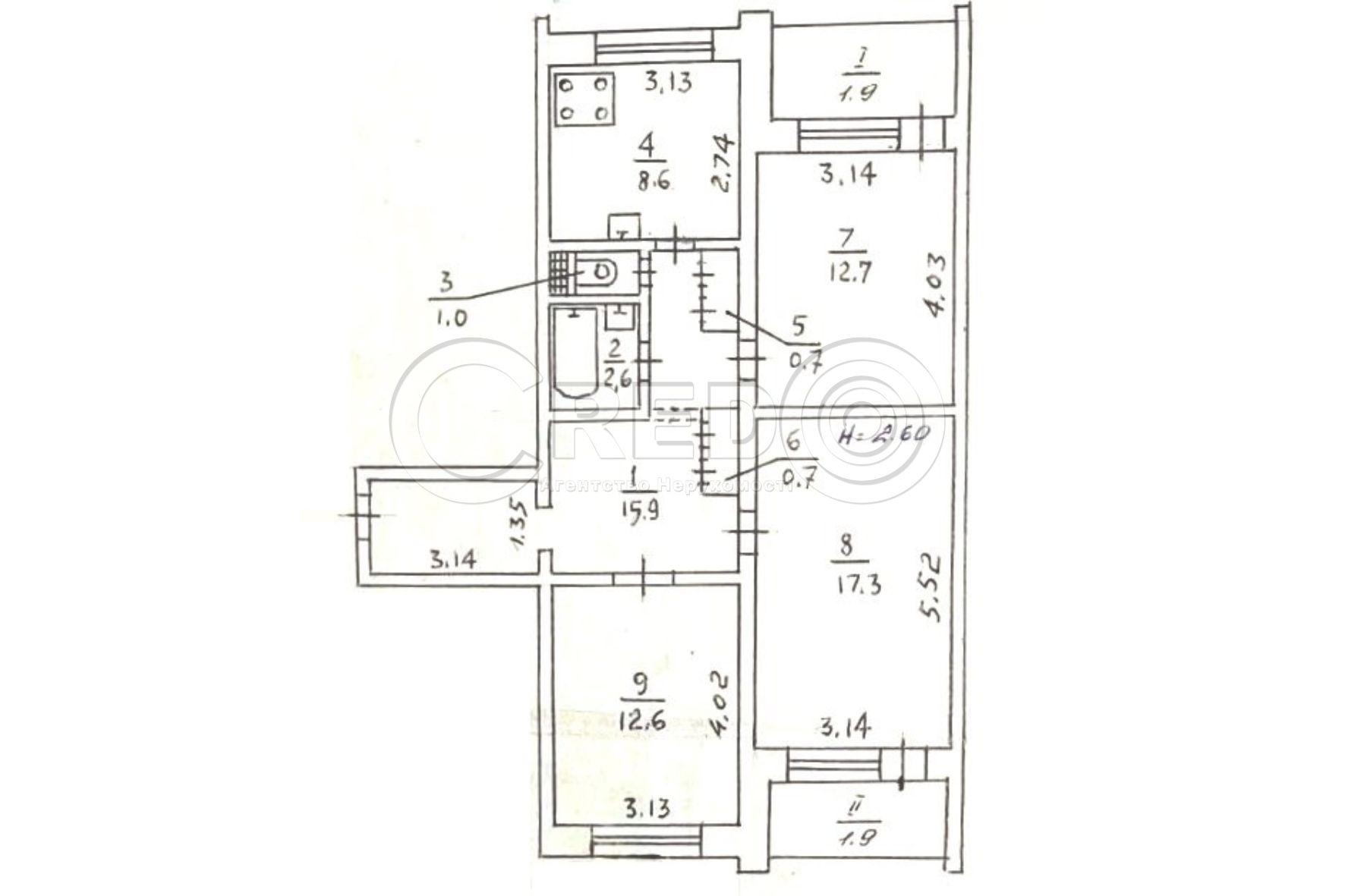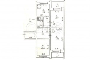 Про об'єкт: - загальна площа 75,9 м.кв. - житлова площа 42,6 м.кв. - кімнати 17,3 + 12,7 + 12,6 м.кв. - кухня 8,6 м.кв. - великий хол та коридор-передпокій.