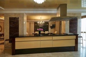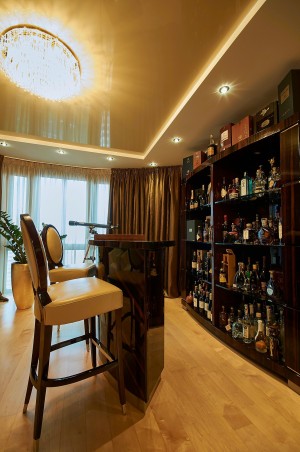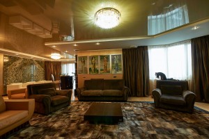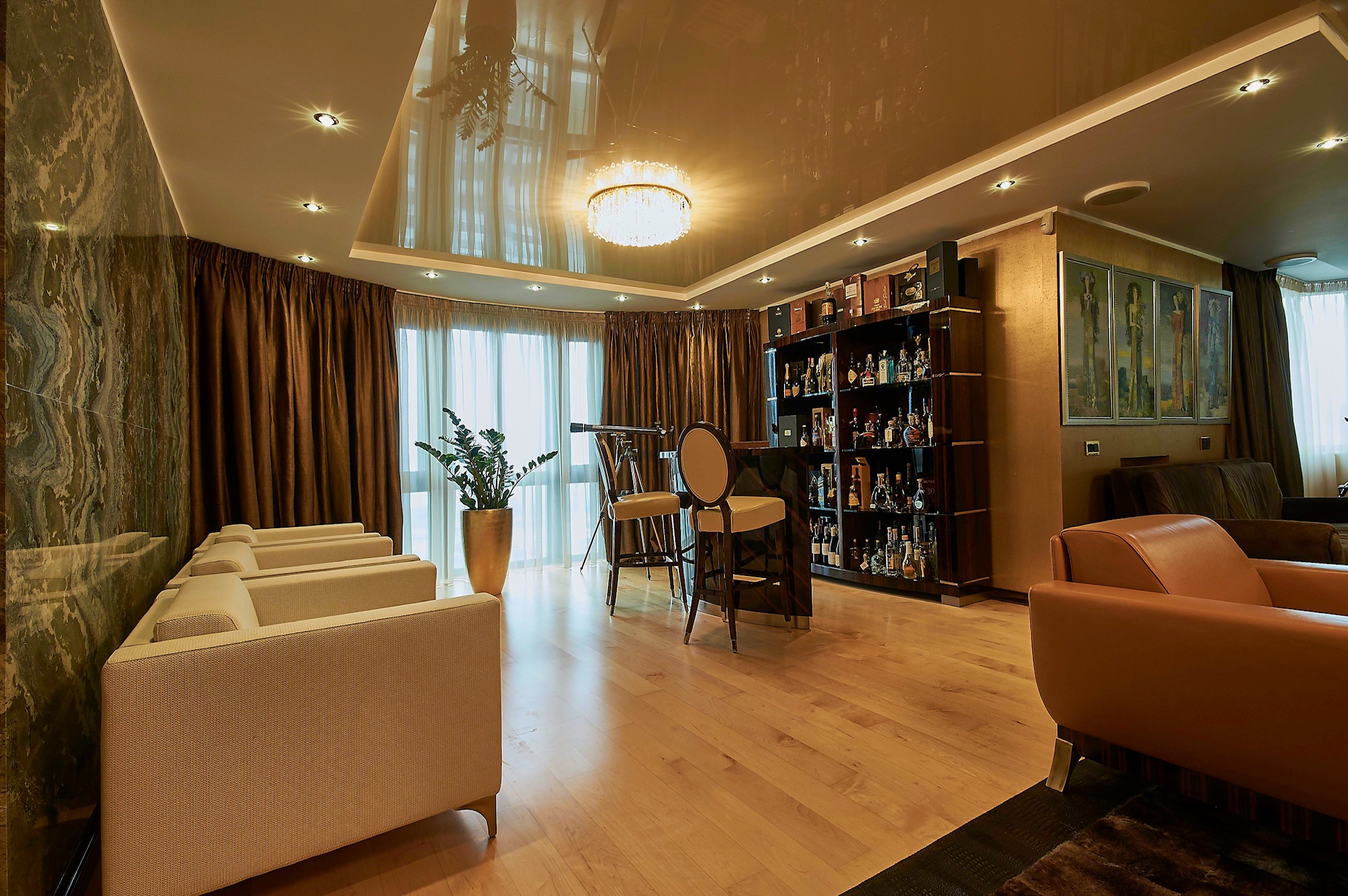 В гостевой половине (96м2) размещены несколько функциональных зон: диванная группа с домашним кинотеатром; лаунж зона с баром и панорамным окном на р.Днепр и скульптуру Родина-Мать; а также гостевая спальня.