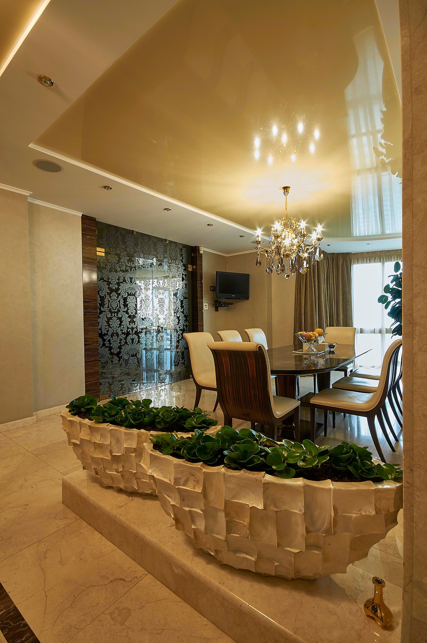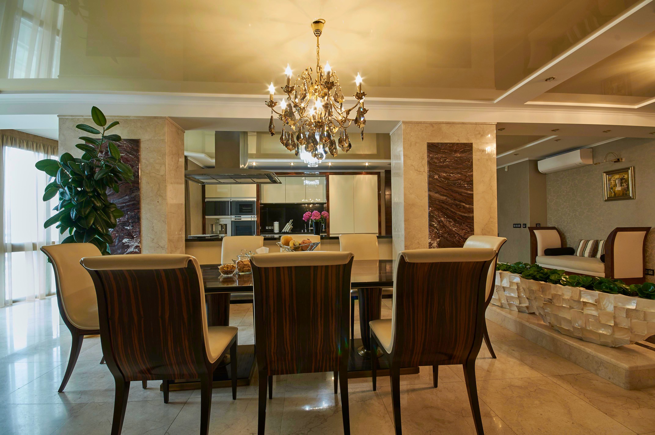 Центральную часть квартиры занимает просторный зал с панорамными окнами, который объединяет в себе большую кухню и обеденную зону (94м2).