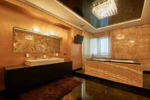 Приватная половина (110м2): две спальни с полноценной ванной комнатой (душ-джакузи, ванная) и большая главная спальня с ванной комнатой с отделкой из оникса (джакузи, душ).