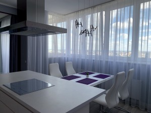 Формат квартири: кухня відділена від вітальні мобільною перегородкою, вітальня з балконом, дві спальні (одна з балконом), два санвузли (один з ванною, другий з душем), передпокій.