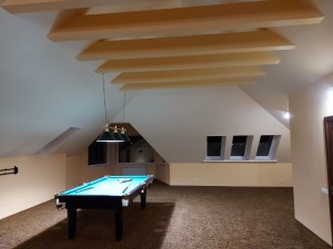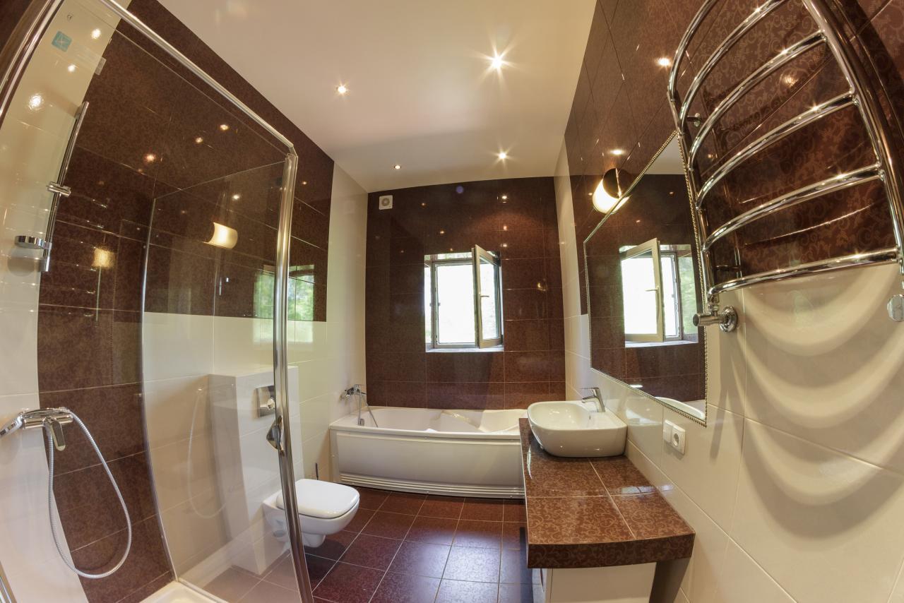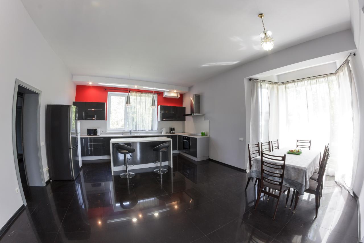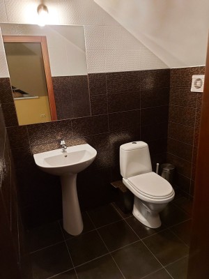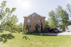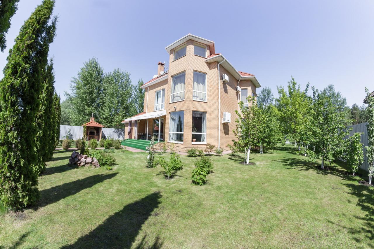 У будинку 5 спалень, 3 санвузли, сауна, спортивна зала 100м2 з більярдним столом, камінний зал 70м2, гараж на 1 авто.