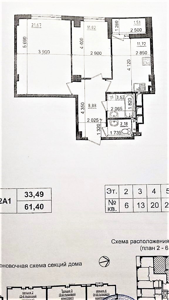 Загальна площа 61,4 кв. м: кухня 11,72 кв. м з балконом 1,51 кв м, 2 роздільні кімнати (21,67 кв. м + 11,82 кв. м), 2 санвузли (3,62 + 2,8) кв м, передпокій.