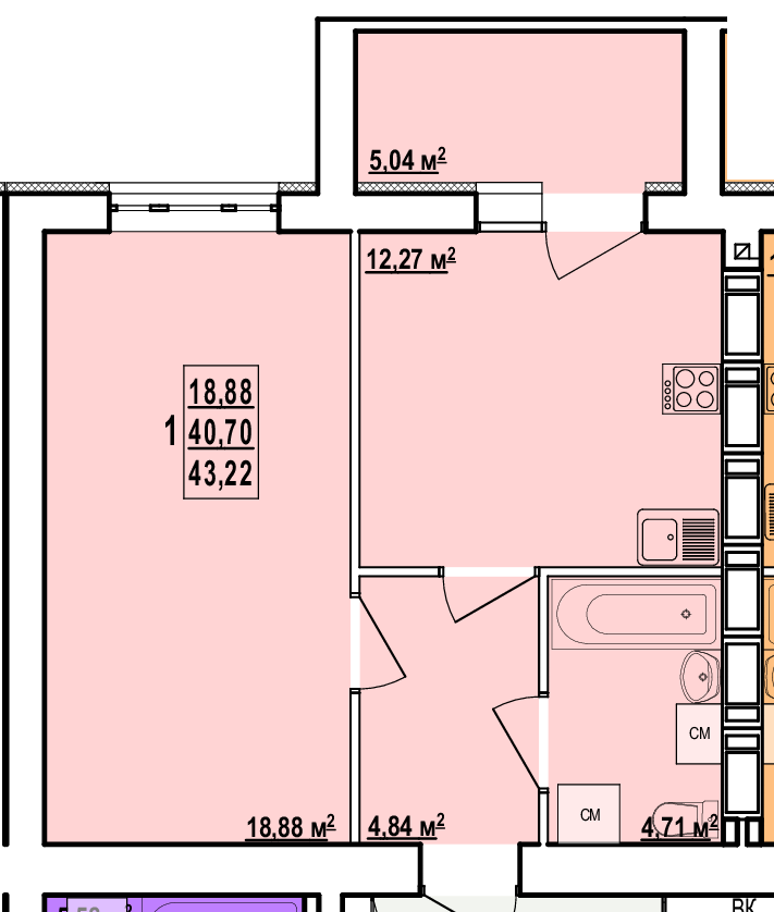Загальна площа - 43 м²;