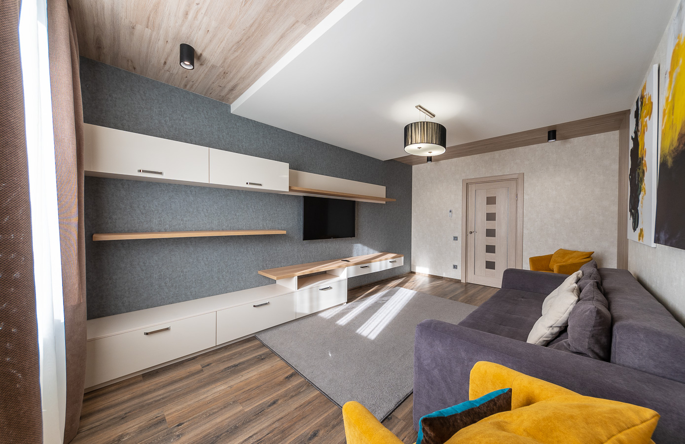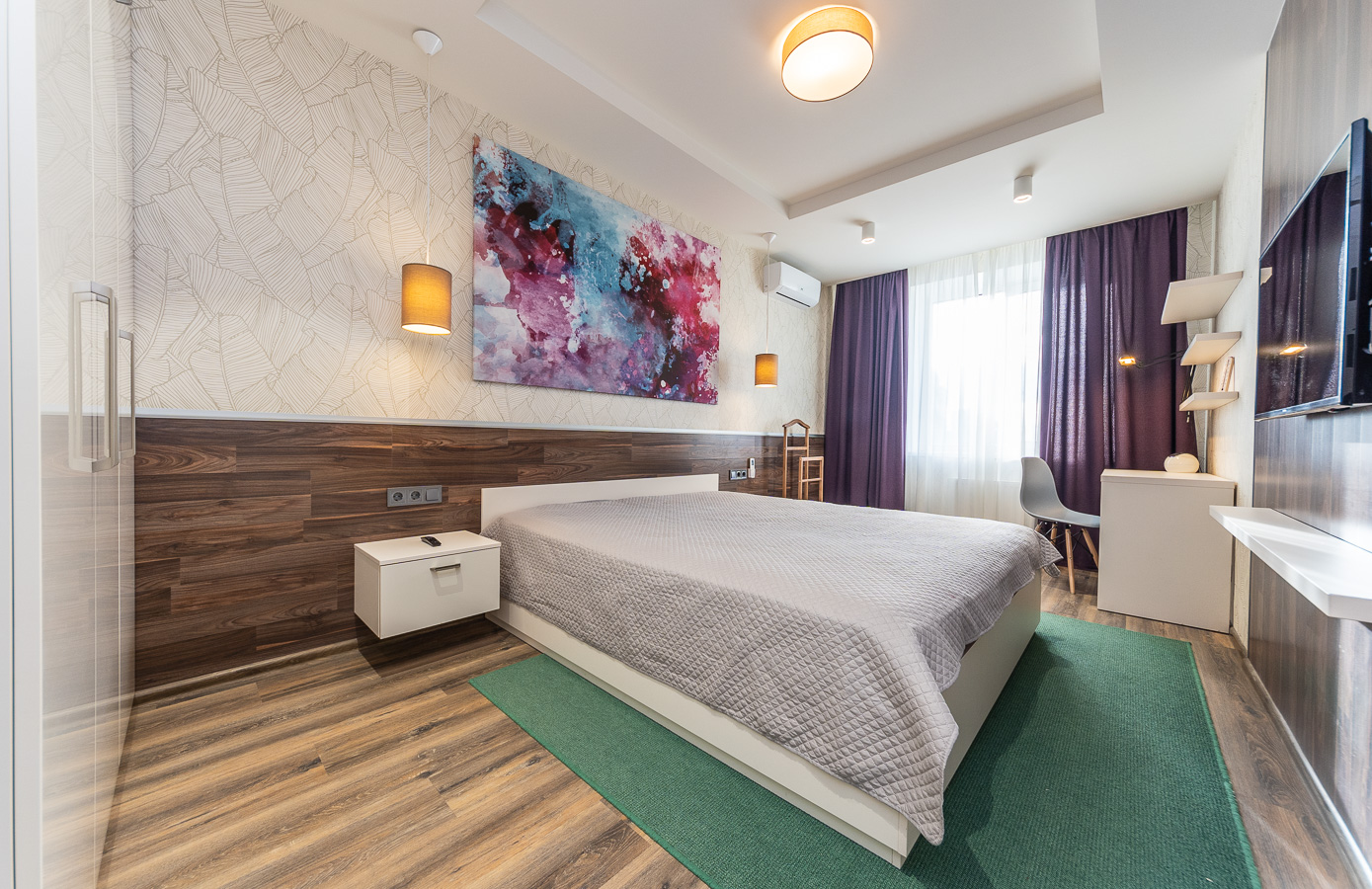 В комнатах 2 больших плоских телевизора. Есть кабельное телевидение и интернет с wi-fi. Раскладной диван и двуспальная кровать. Несколько встроенных шкафов, куда можно спрятать много вещей.