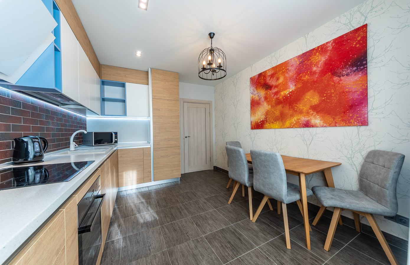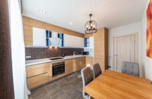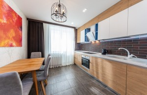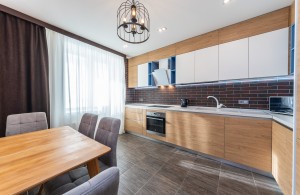 На кухне качественная мебель с доводчиками и дорогой фурнитурой. Вся необходимая бытовая техника: встроенная посудомоечная машина, микроволновая печь, электрочайник, стеклянная варочная поверхность, духовой шкаф, вытяжка, два кондиционера, двухкамерный холодильник с морозильной камерой, стиральная машина автомат BOSCH, утюг, гладильная доска.