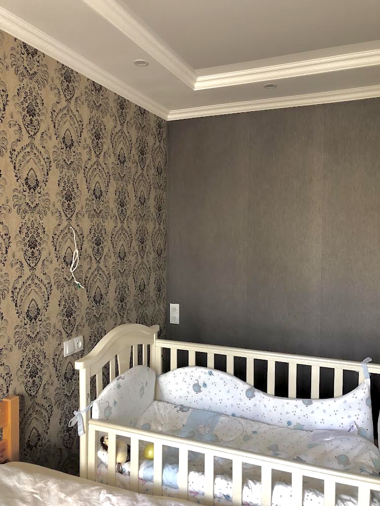 Дубовый стол, огромный шкаф-купе. Спальня 1 (она же детская) огромный раскладной диван с системой хранения вещей, стенка со шкафами, письменный стол. Спальня 2 - 2спальная кровать, детская кроватка, выход на балкон, оснащённый доской Евминова, турником-брусьями, тренажером для пресса.