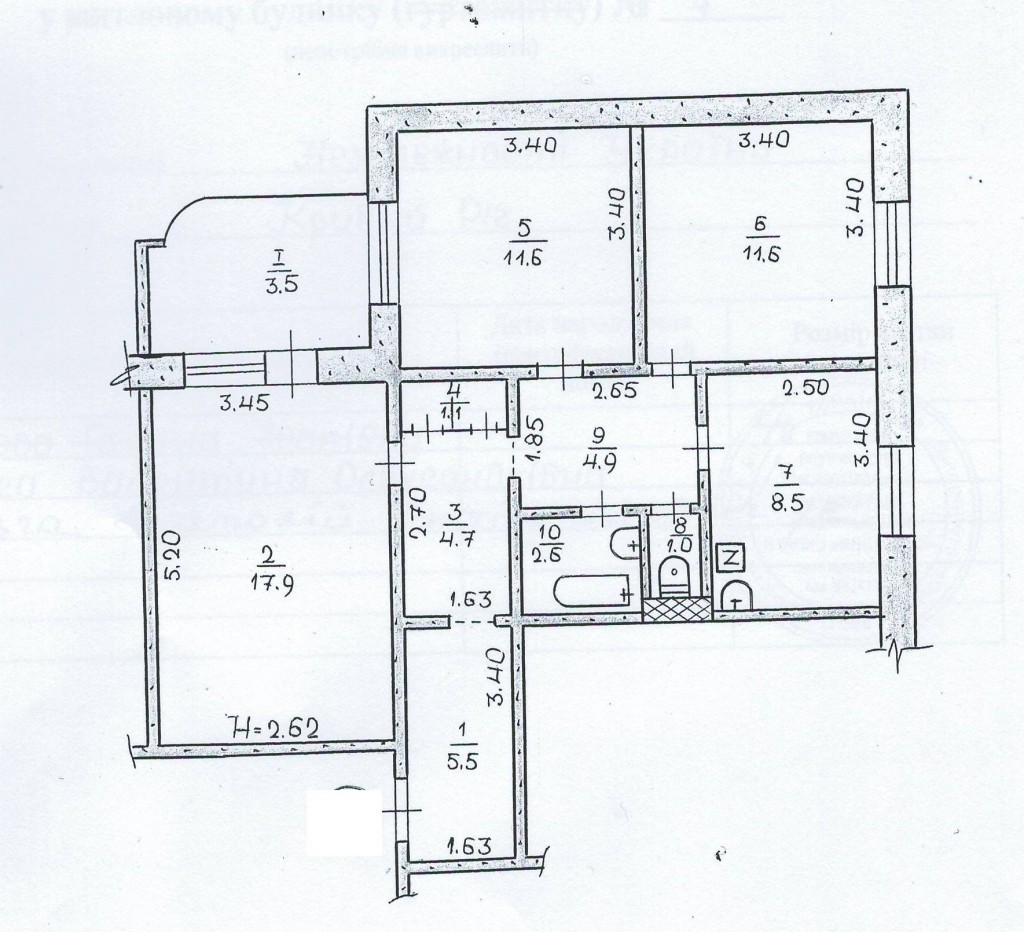 Загальна площа - 72.9 кв.м, житлова - 41.1 кв. м ( 17.9 / 11.5 / 11.5 ), Н-2.62 м, кухня - 8.5 кв.м, коридор - 15.1 кв. 2.6 кв.м, лоджія-3.5 кв.м. Всі кімнати роздільні, житловий стан. Вікна мп, лоджія засклена дерев'яні рами. Труби частково мп, двері всередині квартирні-дерев'яні. Чистий, акуратний під'їзд, поряд магазини, школа, зупинки.
